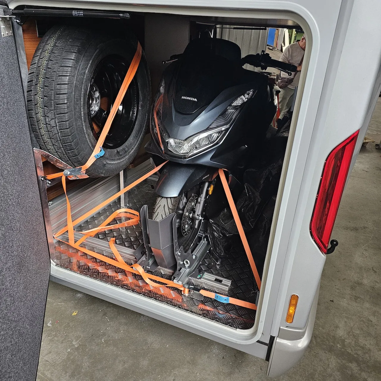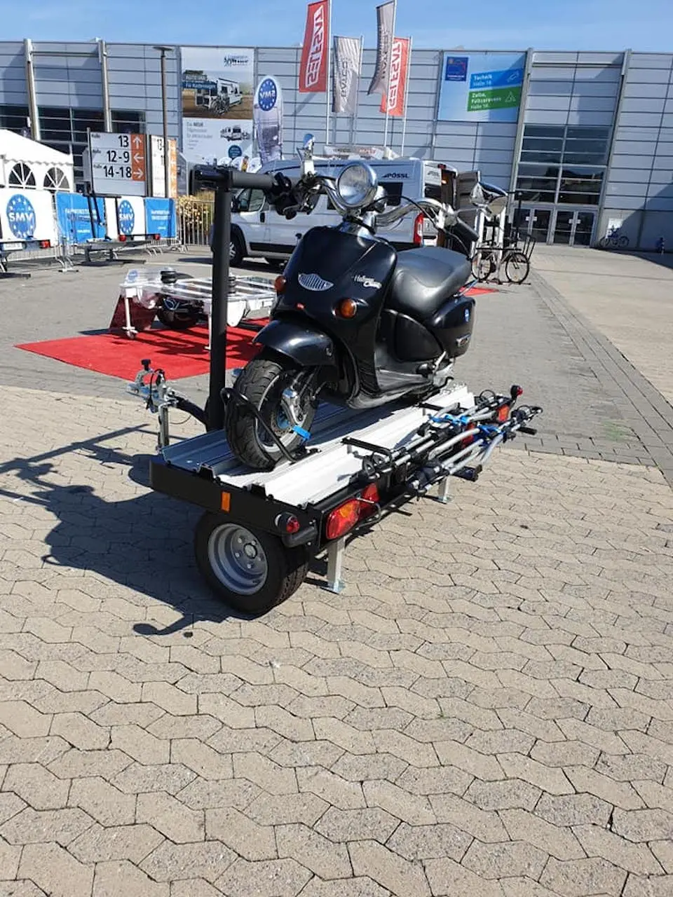 Lässt sich bei angebautem Motoroller leicht zur Seite schieben, einfacher Zugang zur Hecktür